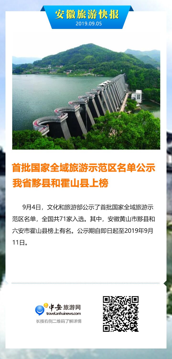 9月4日,文化和旅游部公示首批国家全域旅游示范区名单,全国共71家入选。其中,安徽两地上榜,分别为黄山市黟县和六安市霍山县。扫描海报中二维码看详细内容。