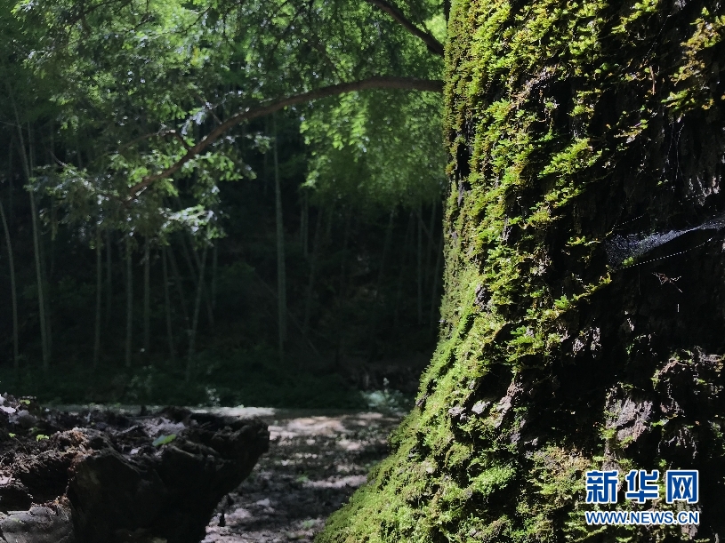 6月1日,位于安徽省休宁县鹤城乡新安源村的皖南最大古树群,青石上长满了苔藓。新华网发(杜国新、陈佳摄)