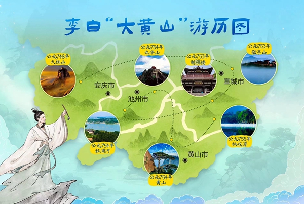 李白“一生好入名山游”,足迹遍布大半个中国并结缘安徽。李白曾三登九华,五游秋浦,七上敬亭山,先后七次来皖并寓居一年之久,最终更是在安徽为自己的人生旅途划上了句号。安徽见证过李白一生的辉煌,李白也留给安徽丰厚的文化遗产。“大黄山”这片土地也因诗仙的多次游历而“走”进唐诗,成为人们心中的诗和远方。