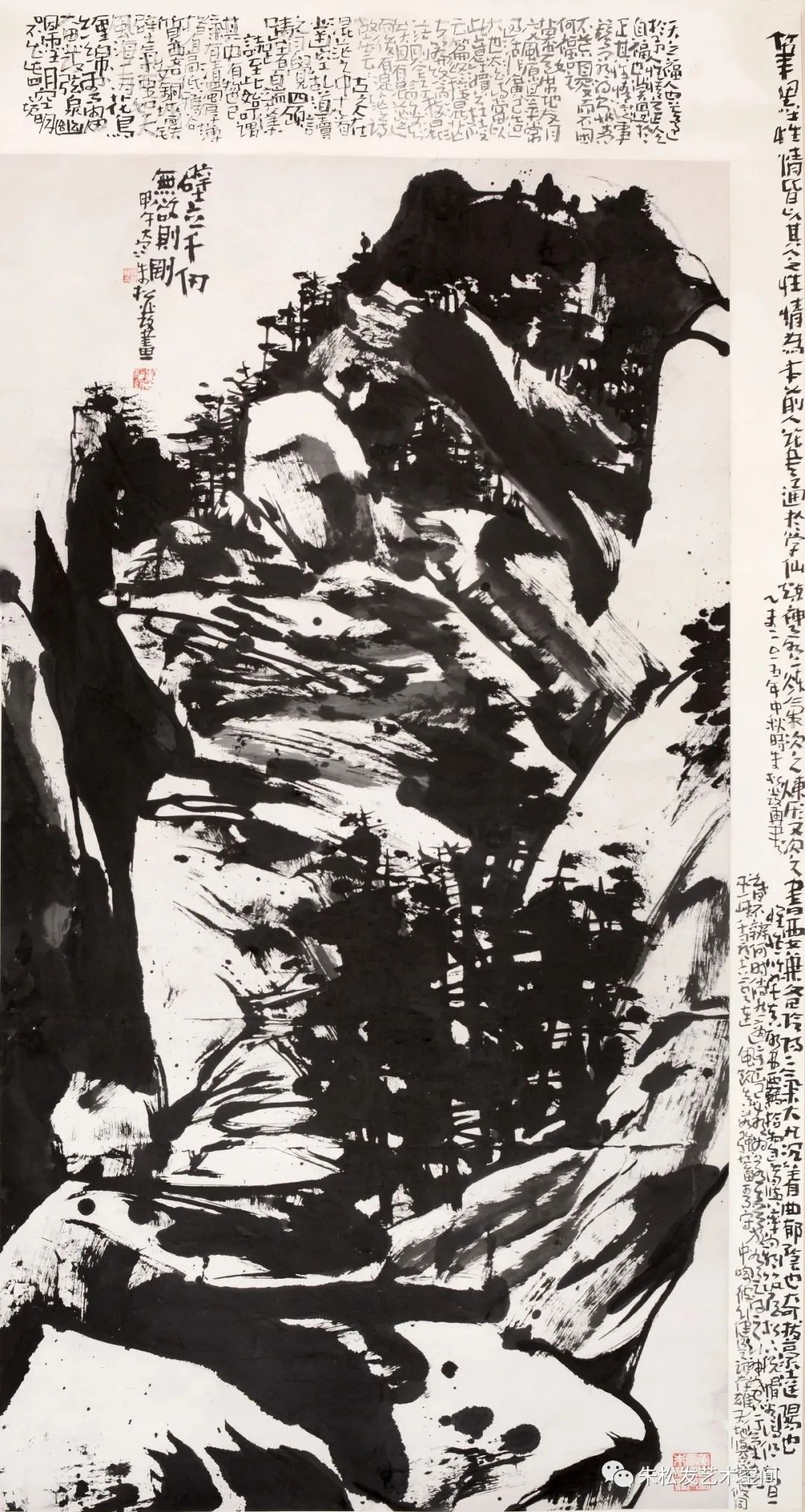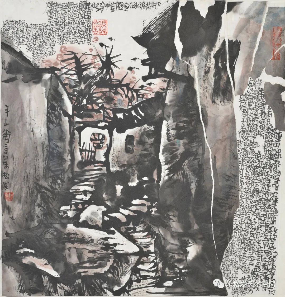 朱松发创作题材广泛,兼容并蓄,他将现代语境下的中国画进行了传统与现代的文化融合,有咏怀述志的写意人物,有铁骨冰心的俊逸梅花,有恣肆磅礴的铁铸江山,书法创作更展示出东方文化书画同源的艺术魅力。焦墨山水画创作代表了朱松发的艺术高峰,其作品承接北宋山水画的浑厚气象,延续新安画派的艺术文脉,展示出积健为雄的正大气象和不断探索的创新精神,开一代写意雄风。