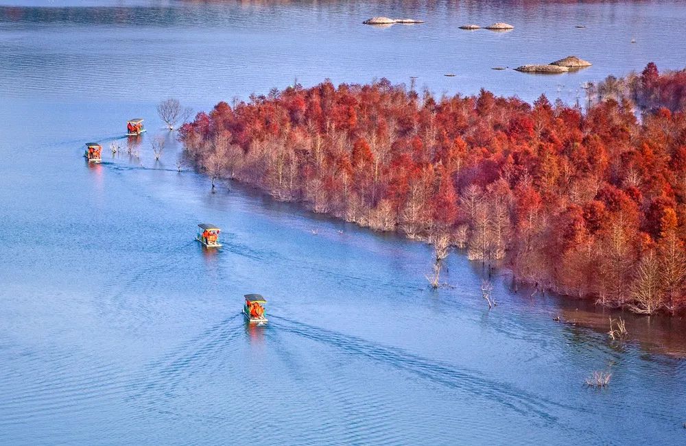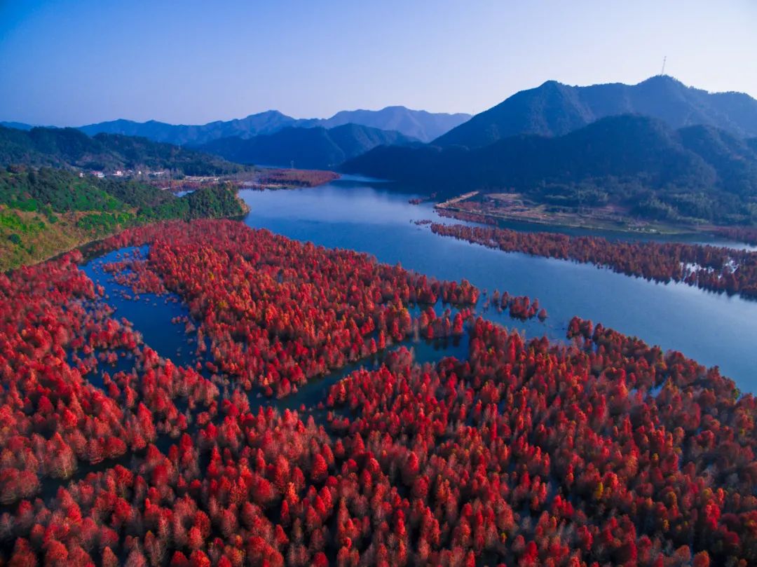 红杉林景点位于方塘乡境内,宛如“皖南喀纳斯”。每到深秋,沿着浅浅的湾流,两千余亩红杉林错落有致的立在水中,与宽广碧绿的水面相互映衬,美不胜收。随着秋天的到来,大片的红杉林开始褪去了清新的绿衣,逐渐披上秋装,甚是好看!