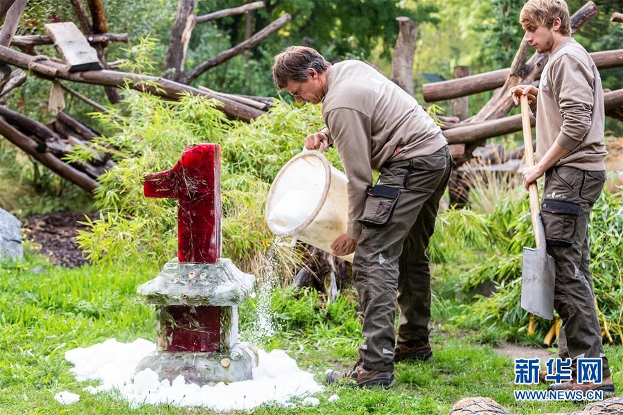 8月31日,在德国柏林动物园,工作人员为大熊猫双胞胎“梦想”和“梦圆”准备“生日蛋糕”。 德国柏林动物园31日为在德出生的大熊猫双胞胎“梦想”和“梦圆”庆祝一周岁生日。旅德大熊猫“梦梦”2019年8月31日在柏林动物园诞下“梦想”和“梦圆”。 新华社发(柏林动物园供图)
