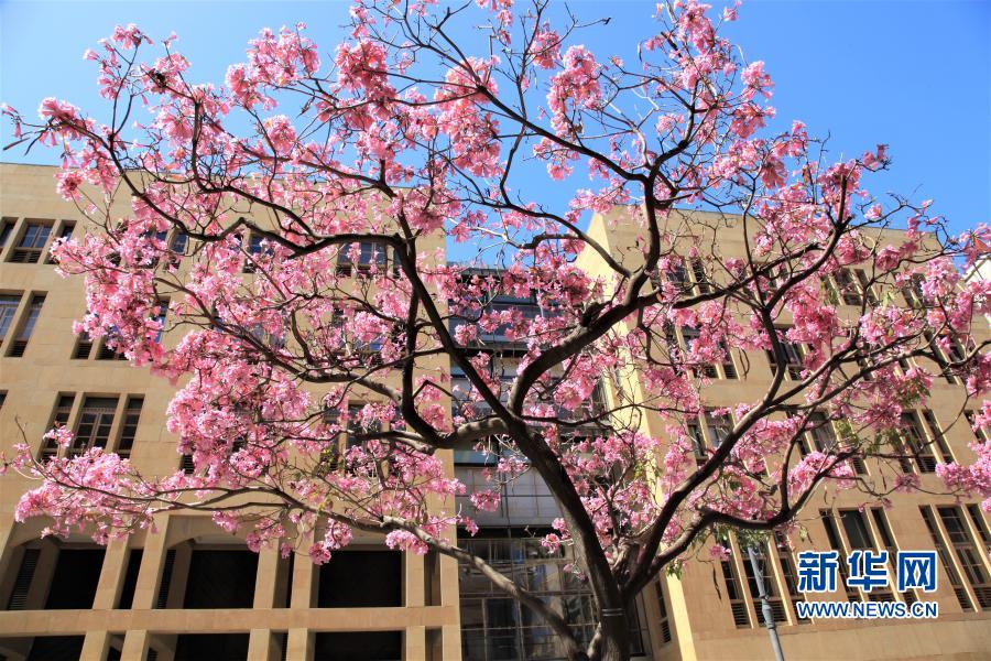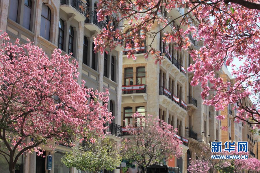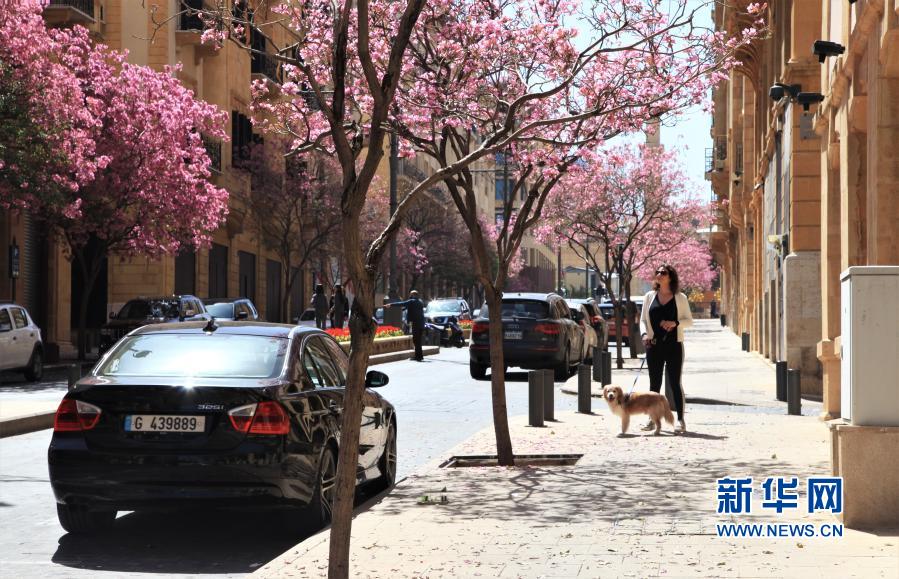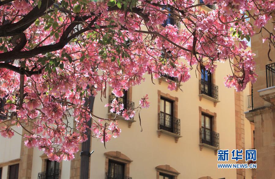 黎巴嫩首都贝鲁特闹市区商业街两旁的风铃木花开正盛,繁花缀满枝头。