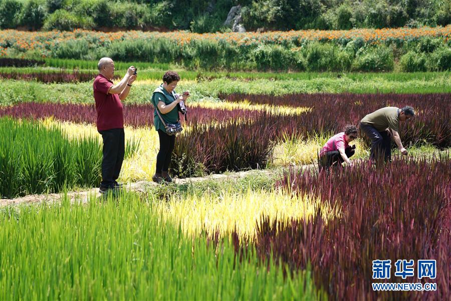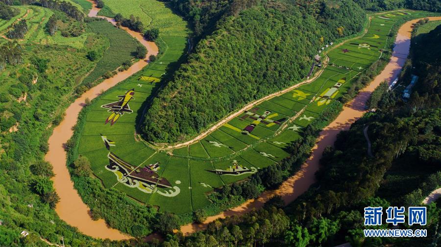 这是8月12日在宜良县九乡麦地冲村拍摄的彩色稻田(无人机拍摄)。 云南省昆明市宜良县着力打造创意农业、景观农业、实现“以农带旅、以旅兴农”的产业发展,其中种植的数百亩彩色稻田,在田间绘制了各类美丽画卷,吸引众多游客前来观光。 新华社记者 胡超 摄