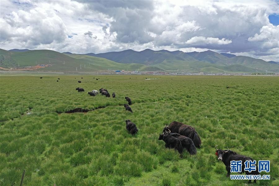 这是西藏当雄县草原上的牦牛(8月9日无人机拍摄)。 进入雨季,藏北当雄县境内的牧场水草丰美,牛羊膘肥体壮。藏北地区是西藏重要的畜牧业产区之一,产自藏北地区的酥油、酸奶、牛羊肉等产品销往各地,是当地牧民的主要收入来源。 新华社记者 普布扎西 摄