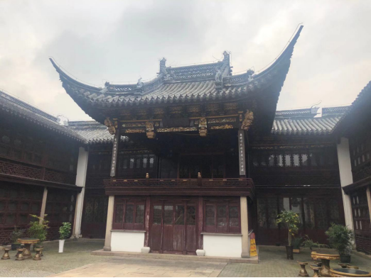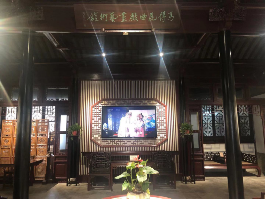走进馆内,古建筑群华丽精致,步步为景,而馆内的百年古典戏台最为独特,“巧夺天工”的古戏台是中国昆曲博物馆的建筑精粹,中国昆曲博物馆工作人员张晓燕告诉大家:“戏台足有二层楼高,二层是戏台,台高约3米,台宽约6.5米,台深约6.5米,戏台基本上呈方形,三面有木栅栏围起来,木栅栏约0.5米。”
