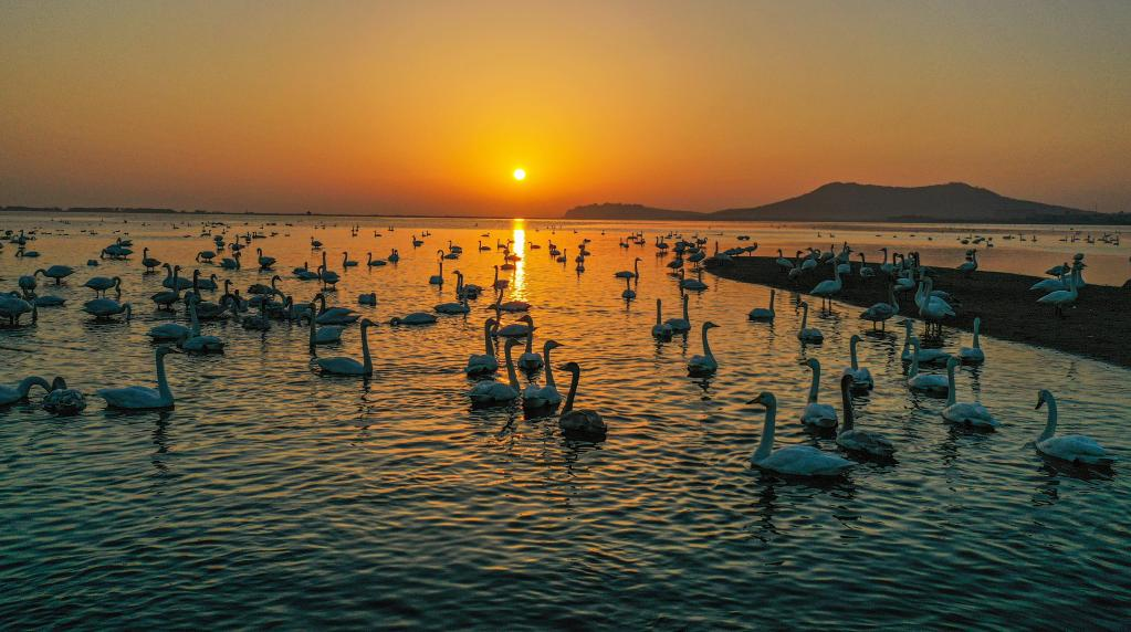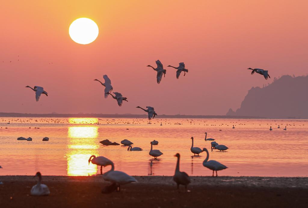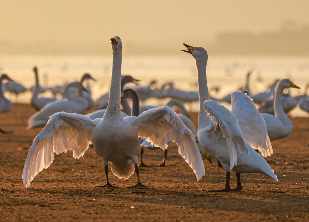 11月14日清晨,在山东省荣成市成山镇天鹅湖,两只大天鹅映着朝霞“引吭对歌”。 冬日清晨,在山东省荣成市成山镇天鹅湖,大天鹅在晨曦中游弋、漫步、觅食,构成一幅和谐的生态画卷。 新华社发(李信君摄)