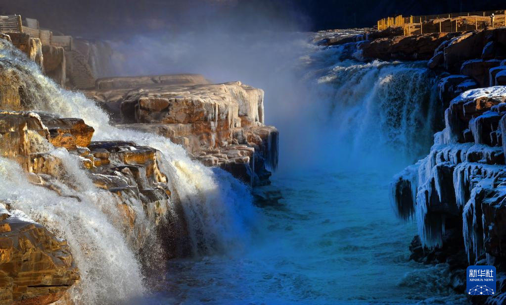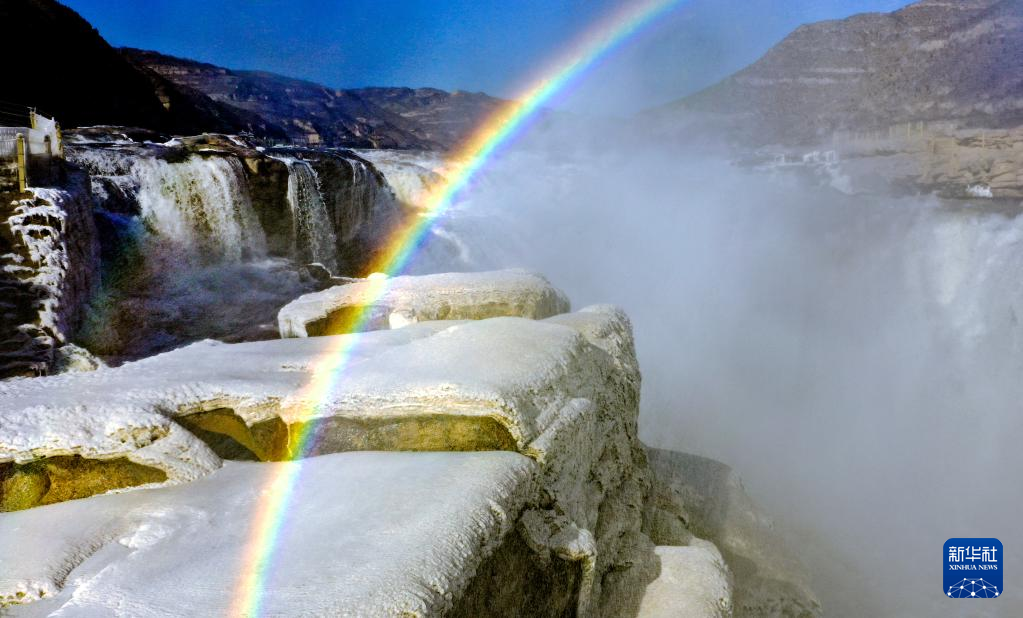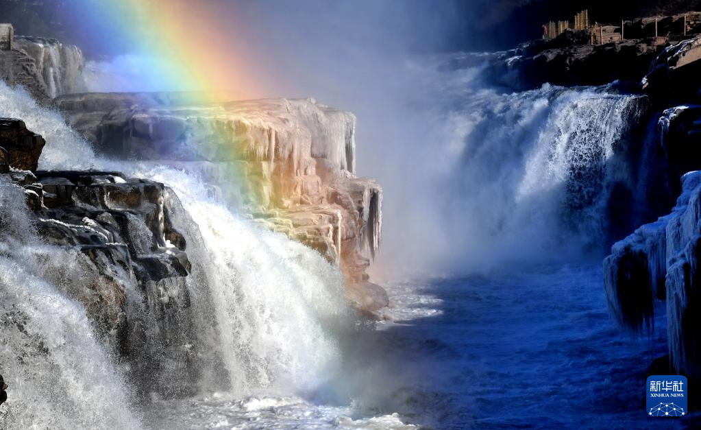 近日,随着气温骤降,黄河壶口瀑布呈现出别样奇观:飞溅的浪花,在两岸崖壁之上凝固成巨大冰瀑,点缀着一条条银装素裹的冰柱,玲珑剔透,错落有致;激起的水雾,在阳光的映射下,彩虹横亘其间,宛如一幅幅画卷。