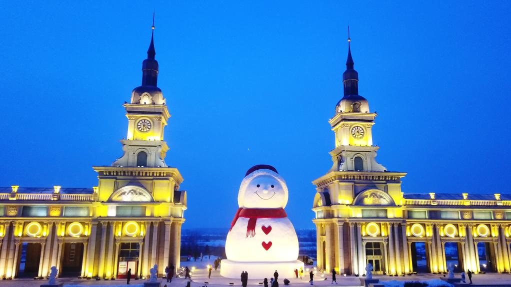 近日,一个巨型雪人亮相冰城哈尔滨松花江畔,吸引市民游客前来打卡拍照。戴着红帽子、红围脖,嘴角上扬的巨型雪人高约18米,宽约13米,用雪量2000余立方米。