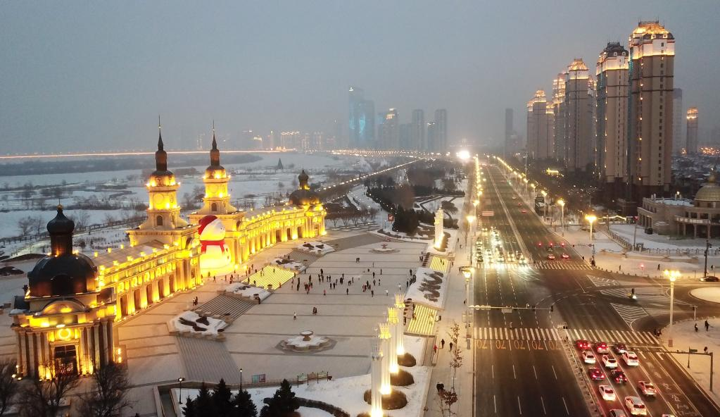 这是1月9日拍摄的哈尔滨松花江畔的巨型雪人(无人机照片)。