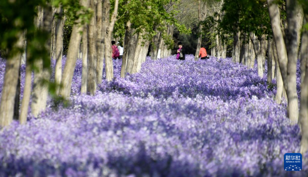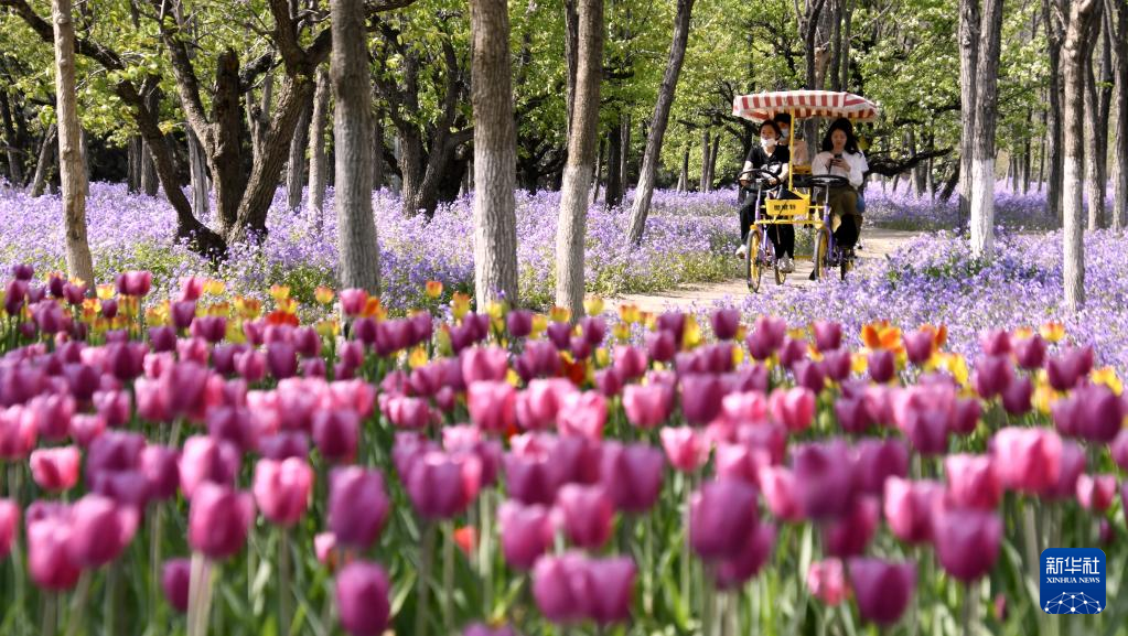 4月19日,游人在北臧村镇永定河畔的绿色港湾林间赏花。