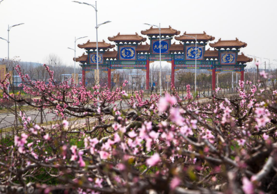 还没进大明园,光是漫步路旁,远远就能看见山坡上正盛放的桃花,沐浴在阳光下。微风拂过,枝头微颤,朵朵桃花上下纷飞,像飞舞的蝶。独具特色的明代风格建筑,和桃花交相辉映,美不胜收。