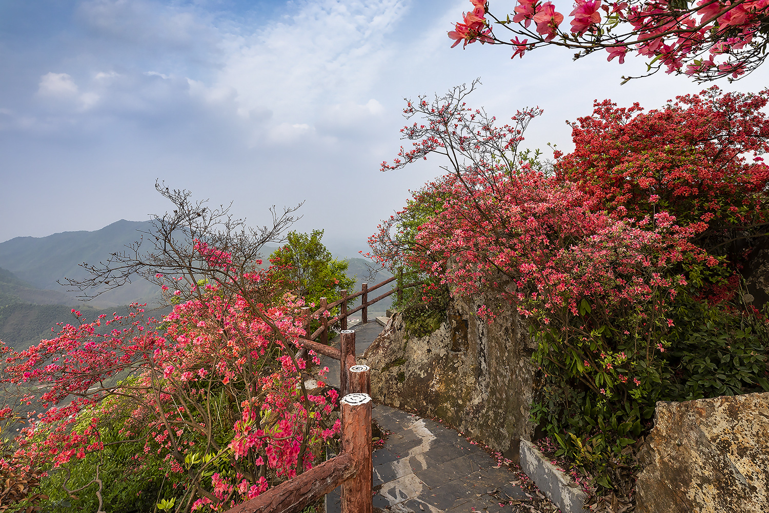 清晨,阳光透过淡淡的雾气洒在屋脊山上,山顶的杜鹃花吐芳蓓蕾、娇艳欲滴,在青山绿树间云蒸霞蔚,让整座屋脊山都显得空灵含蓄又热情如火。