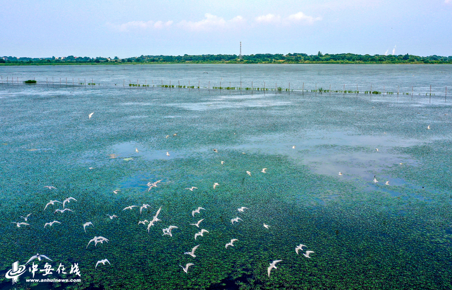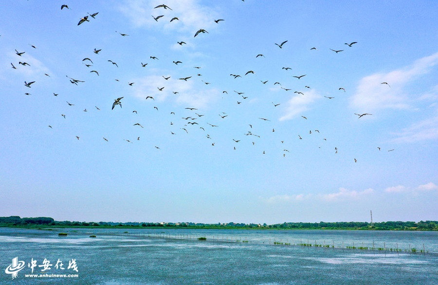 近年来,庐江县加大力度对湖区生态环境保护,退渔还湖使得水质得到较大改善,重现碧水蓝天。一年四季,大量候鸟来此觅食、歇息。鸟儿时而集聚盘旋,时而嬉戏于水中,形成了一道靓丽的风景。(左学长徽镜映像工作室记者刘玉才)