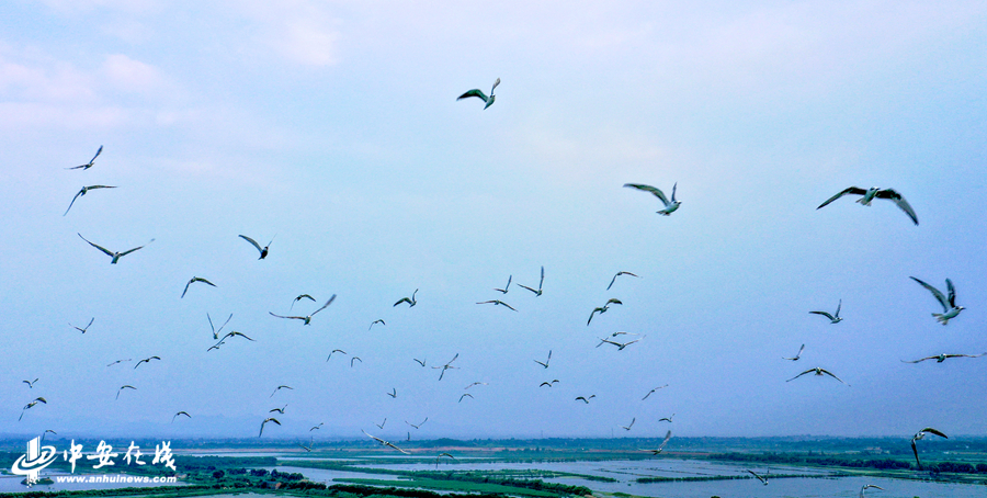 安徽省庐江县黄陂湖为浅草型湖泊,4.5万亩水面,盛夏时节,成群结队的候鸟在黄陂湖的浩渺湖面上自由飞翔,碧水蓝天飞鸟和村落构成一幅壮美的生态画卷。