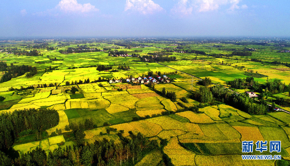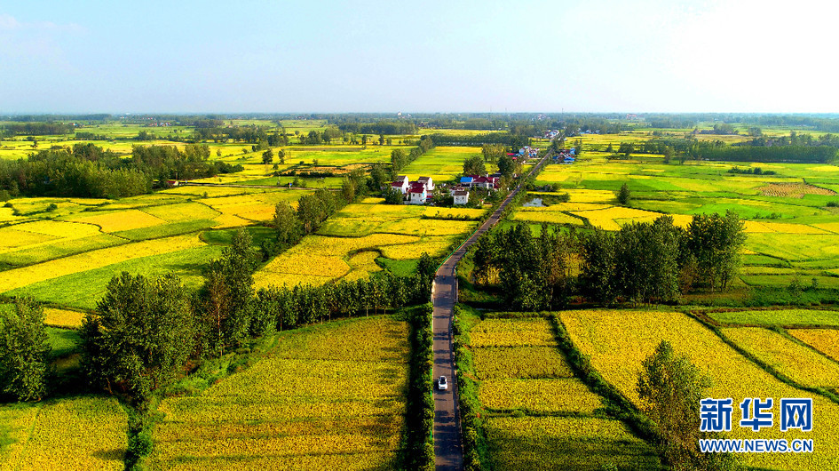 8月31日,霍邱县夏店镇黄竹园村田野里成熟的水稻如同金色画卷。(无人机拍摄)