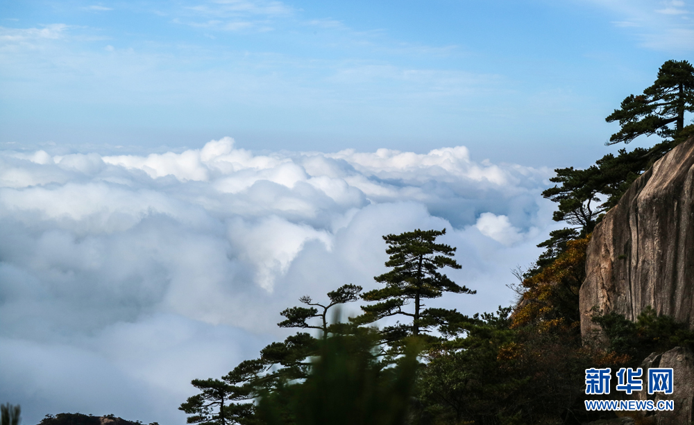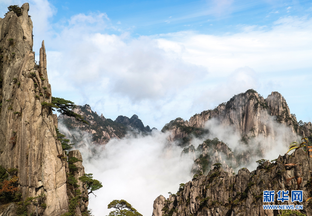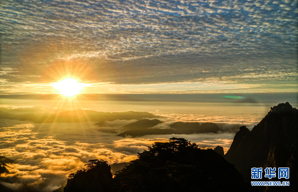 当日清晨,雨后的安徽黄山风景区出现日出与云海景观,群峰在云海间时隐时现,宛如仙境。游客纷纷拿起相机、手机,记录下这一壮观景象。新华网发(李金刚 摄)