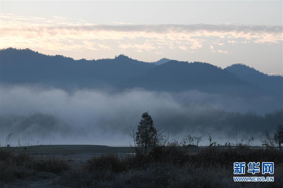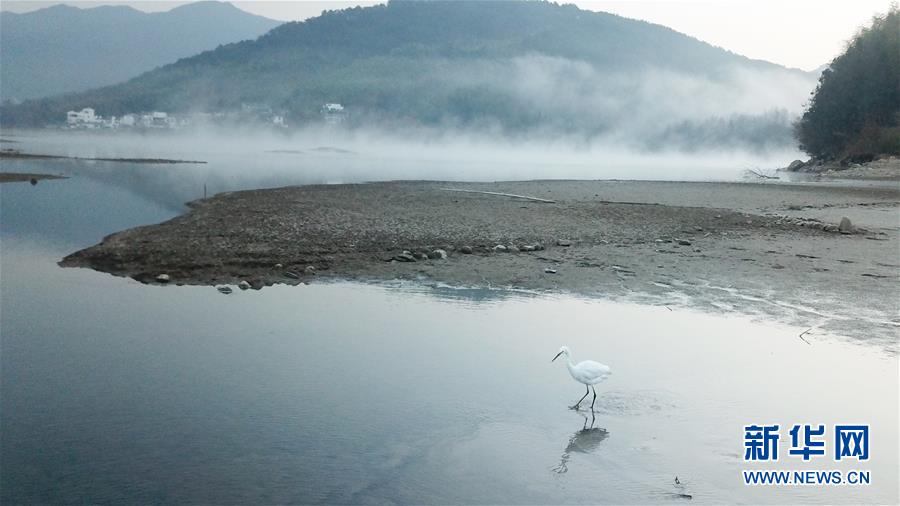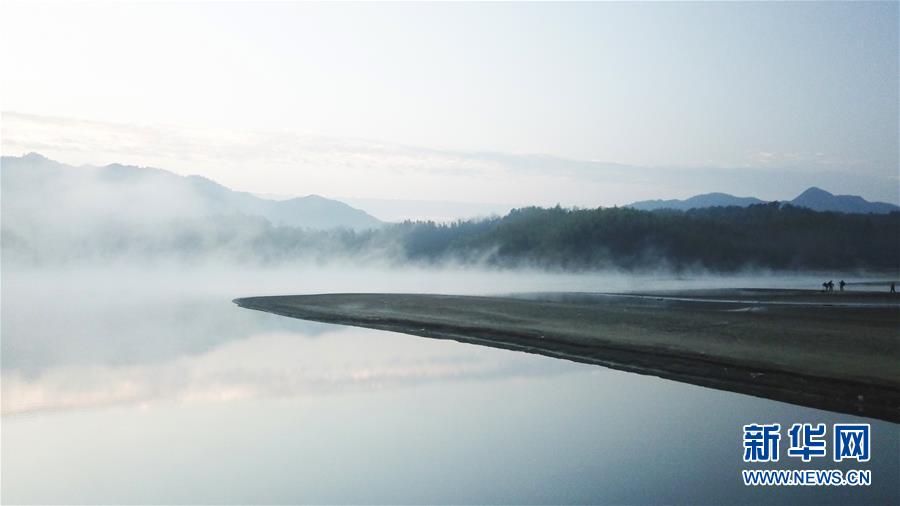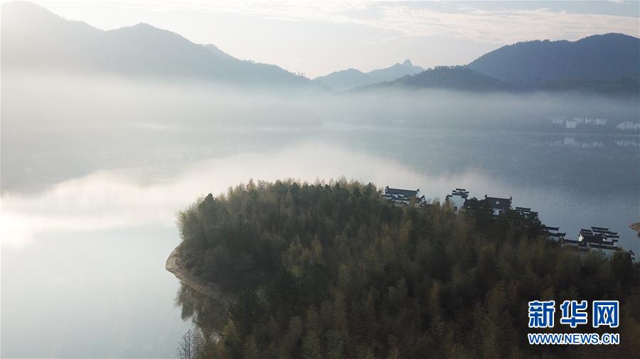 12月5日无人机拍摄的安徽黟县奇墅湖晨景。冬日时节,安徽省黄山市黟县奇墅湖晨雾缥缈,呈现出一幅美丽的冬日画卷。新华社记者张端摄