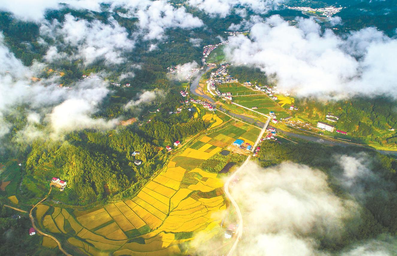 这是近日航拍的岳西县菖蒲镇雨后秋色。当地水畈村、毛畈村的水稻迎来收获季节,一块块稻田在青山薄雾的映衬下,显得格外金黄。 (通讯员 小龙 徐进群 摄)