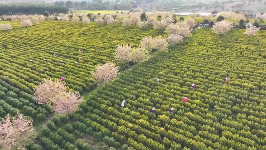 春光明媚,茶山叠翠。在宣城市郎溪县建平镇精忠村,上千亩的茶园里,粉白色的樱花与绿色的茶树相映成趣。游客们一边欣赏美丽的茶园风光,一边品尝着醇香的茗茶,感受着茶文化的独特魅力。