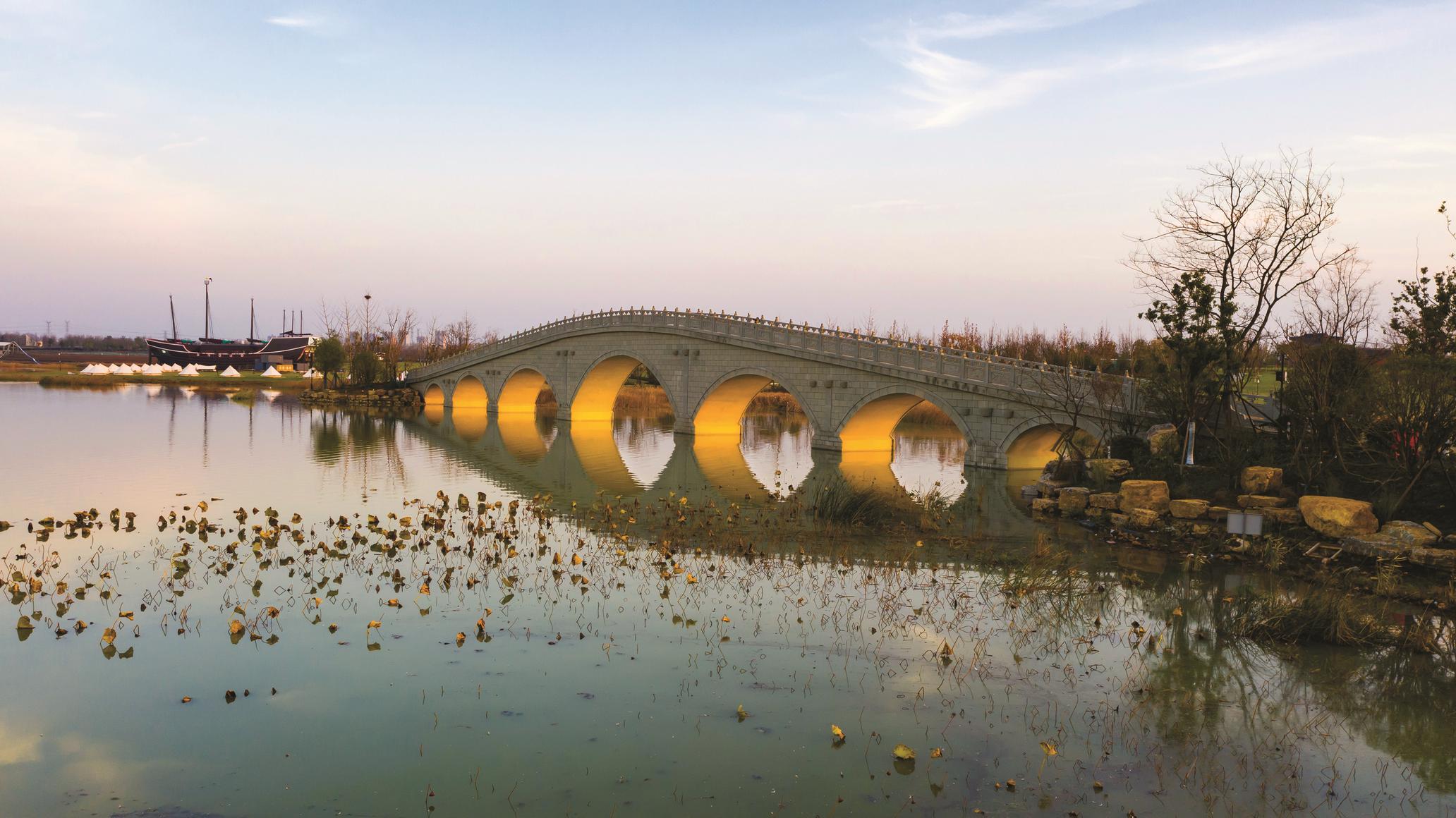明湖四时之景不同。位于城南奥体中心附近的七孔桥,在冬至前后,当落日运行到最低点时,阳光会贯穿整个桥洞,将所有的桥洞染成金灿灿的颜色,呈现出被人们称为“金光穿洞”的独特景象,十分壮观。“金光穿洞”景象需特定角度照射和观看才能显现,由于冬季落日照射时间短,景象稍纵即逝,可谓奇特。(全媒体记者卢志永摄)