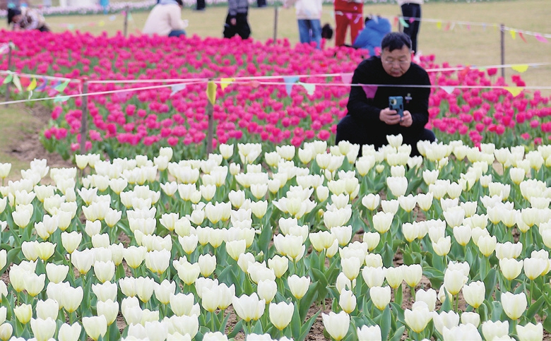 3月28日,阜合园区颍淮花园内,各色郁金香肆意绽放,吸引不少游客前往赏花观景。去年12月,颍淮花园种下3000多平方米的郁金香,经过精心养护,今年3月郁金香陆续开放,成为园内一道靓丽风景线。记者 庞诚 摄