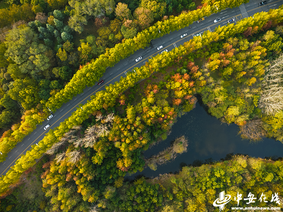 深秋尚未远去,初冬已然降临。11月16日,合肥蜀山森林公园沐浴在傍晚金色的阳光中,山上层林尽染、植被五彩斑斓,仿若打翻了的调色盘。山脚下的枫林路也披上了一层“冬装”,从高空俯瞰,金黄的梧桐、火红的枫树夹道而立,蜿蜒曲折的道路像是一条项链环山而行。夕阳的光辉,映照着一幅城市生态画卷。(记者 许梦宇 罗中琳)