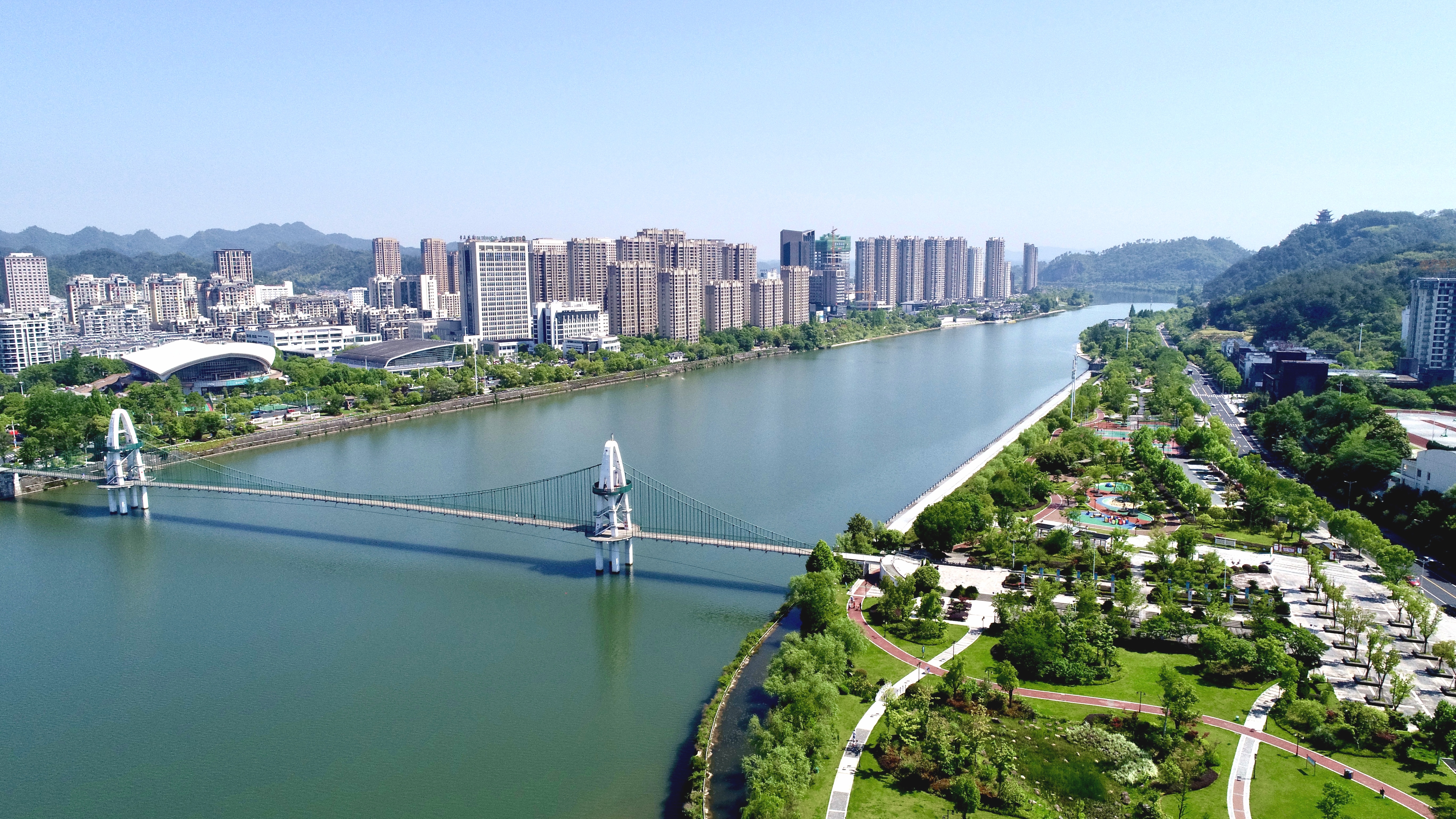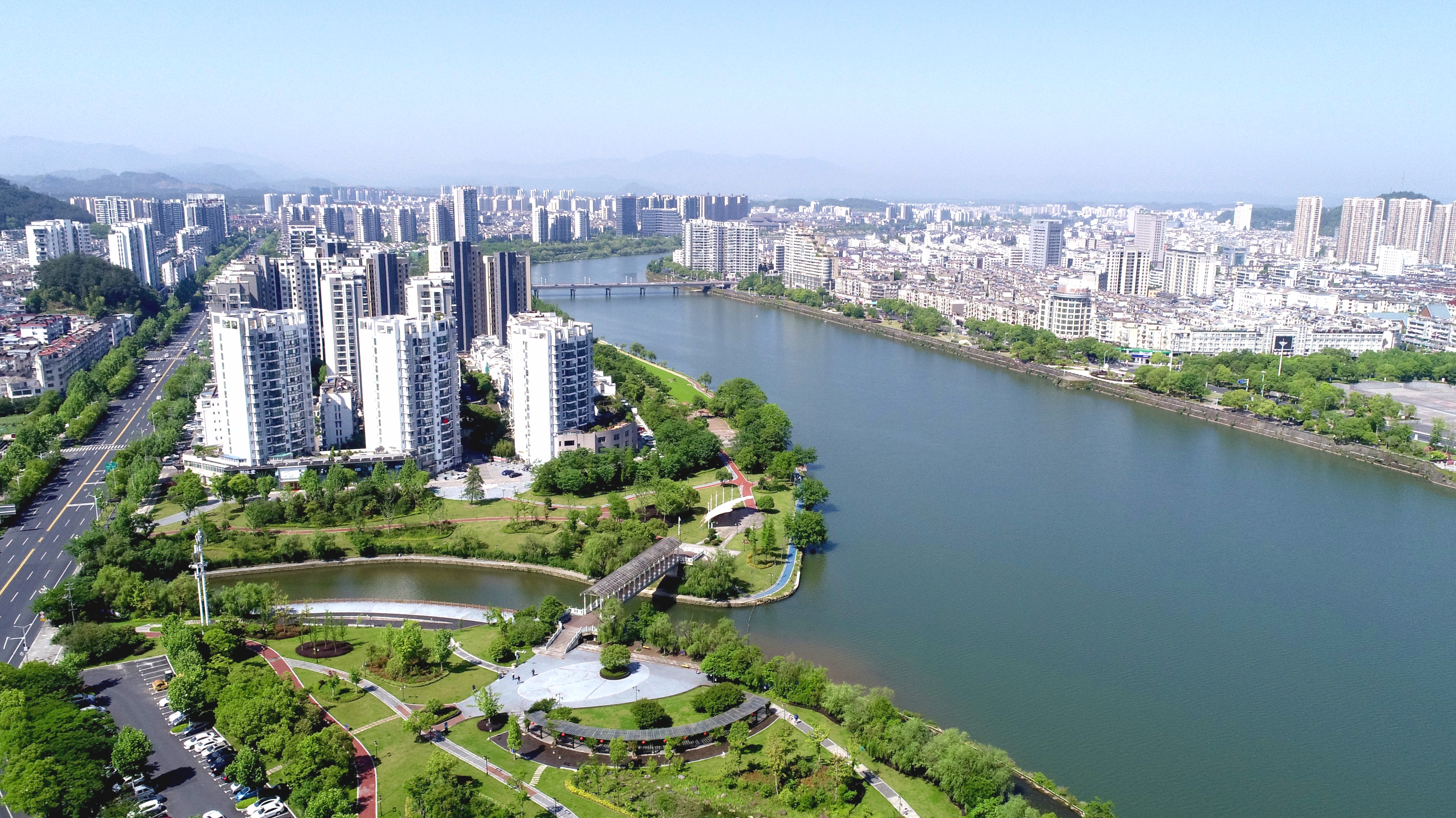 初夏的江南,阳光明媚,俯瞰黄山市新安江屯溪段,水清天蓝,河堤两岸郁郁葱葱,如诗如画,令人陶醉……一幅和谐宜居、生态优美的画卷徐徐展开。