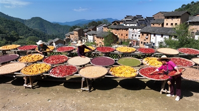 9月18日,趁着晴好天气,歙县阳产村民在房前屋后晾晒收获的玉米、红辣椒、山核桃、南瓜等。五颜六色的农作物与鳞次栉比的土楼交相辉映,共同勾勒出一幅别有风味的山村“晒秋”图。