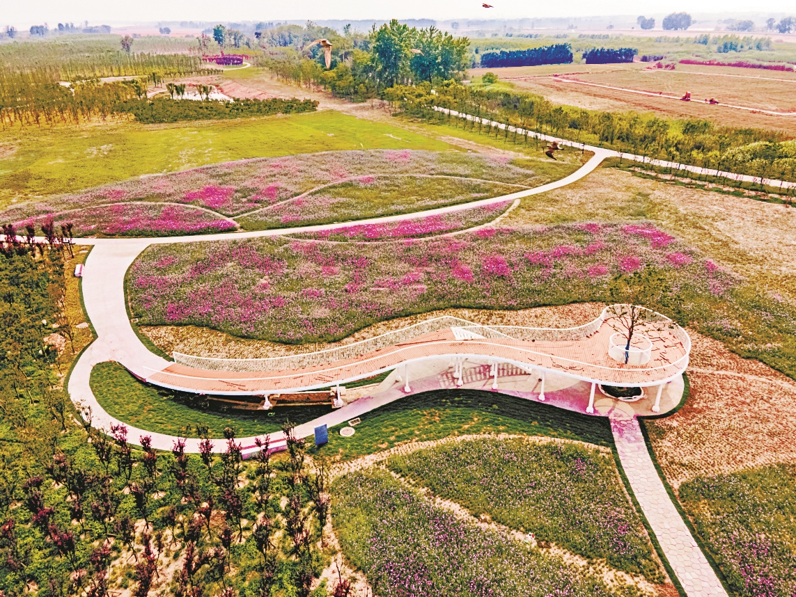 面积逾两万平方米的花海,连片的池杉林、紫薇林,35亩的绿色草坪,凭栏远眺的观江台……7月10日,经马和汽渡过江后,沿着岸线驱车向南行进约五分钟,就来到位于和县的浮沙圩湿地公园。这里,一个个景点“串珠成链”,犹如一条“翡翠项链”。