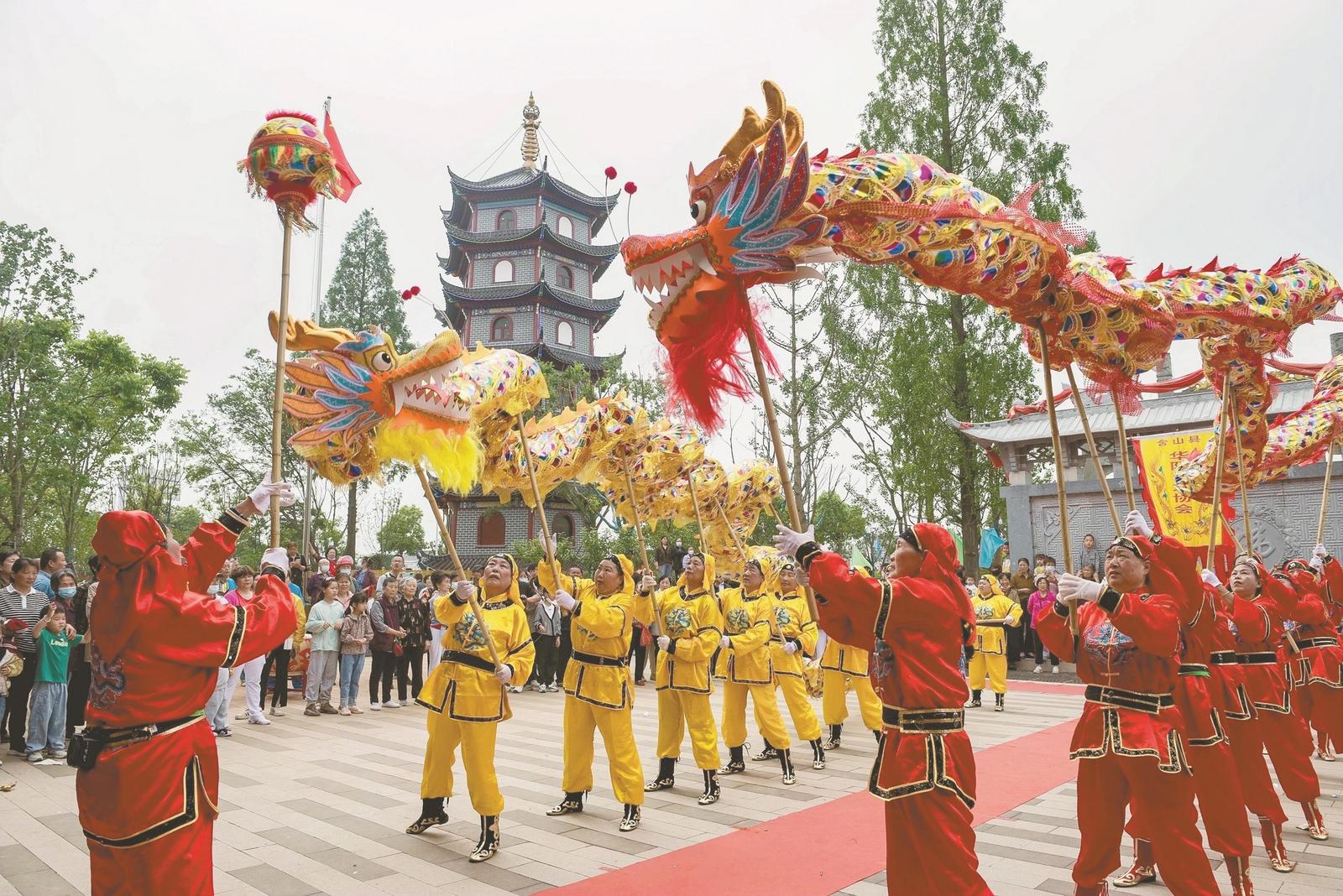 5月20日,含山县环峰镇华阳社区华阳舞龙协会在当地庙会上展演舞龙、猪八戒背媳妇、挑花挑等丰富多彩的民俗节目,弘扬传统文化,丰富群众文化生活。通讯员 欧宗涛 摄