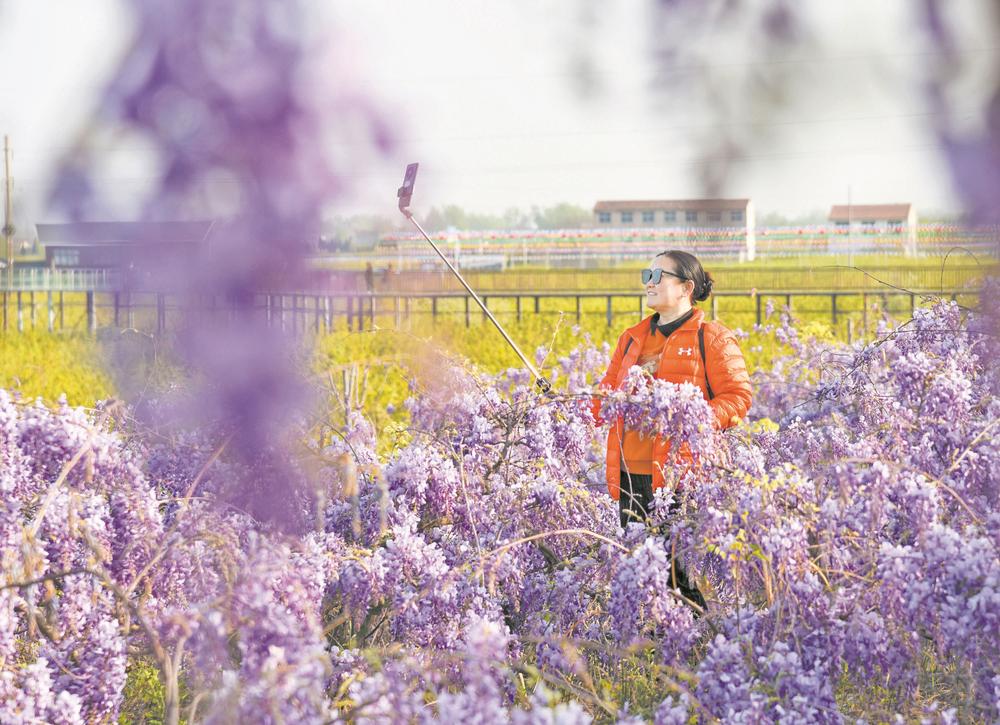 4月10日,砀山县良梨镇马庄村的葛花滩公园内,野生紫藤花竞相绽放,美丽的田园风光吸引众多游客前来打卡赏花。