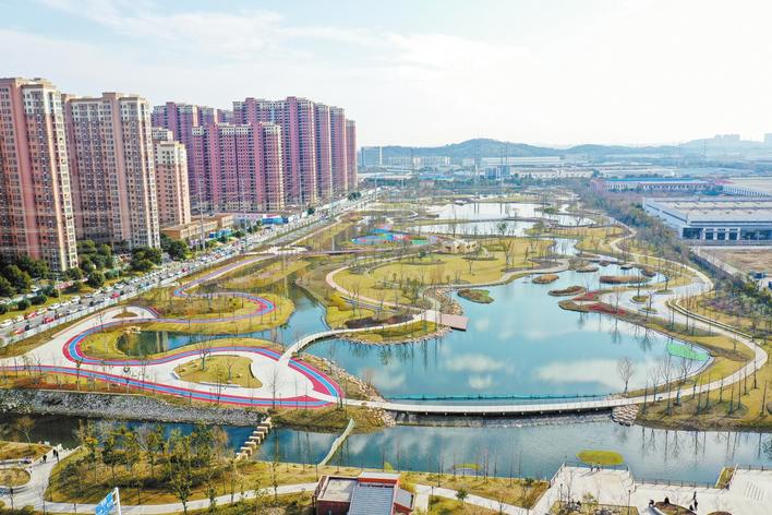 近年来,芜湖市不断提升城市颜值,以积极践行人民城市建设为契机,新建改建一批公园,提升城市品质,让市民群众“出门见绿、移步入园”,满足市民就近休闲、健身运动需求。图为日前俯瞰经开区北区中心公园,该公园东至松花江路,南至泰山路,占地面积242亩。(记者 陈剑 摄)