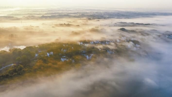 11月29日早上,湾沚区水梦南湖平流雾缓缓流动。伴随着清晨第一缕阳光的升起,薄雾渐渐散开,水梦南湖畔的龙尾张自然村雾气飘飘,宛如仙境。(记者 许诚 通讯员 李明仙 摄)