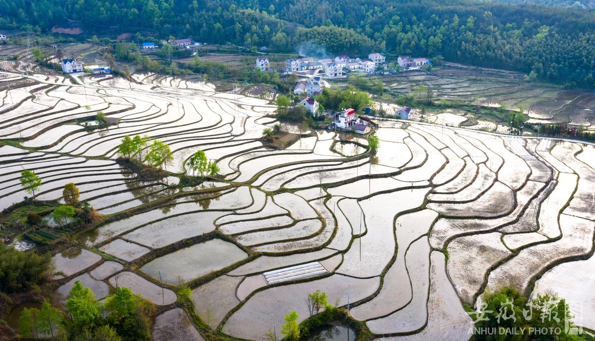 4月13日拍摄的宣城市旌德县兴隆镇三山村错落有致的万亩“云上梯田”。近年来,当地整合旅游资源,以旅助农、以旅兴农、以旅富农,助力乡村振兴。(特约摄影 袁家权 通讯员 朱学文 摄)