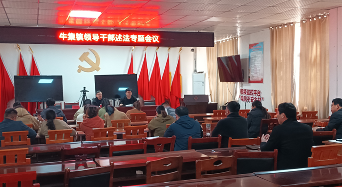 牛集镇开展领导干部述法专题会议。牛集镇党委书记王涛围绕2023年度履行推进党政法治建设第一责任人履职情况、学习宣传贯彻习近平法治思想、领导干部学法用法、重大事项依法决策、依法履职等方面分别作专题述法,并报告了本人在履职过程中存在的不足以及下步工作打算。