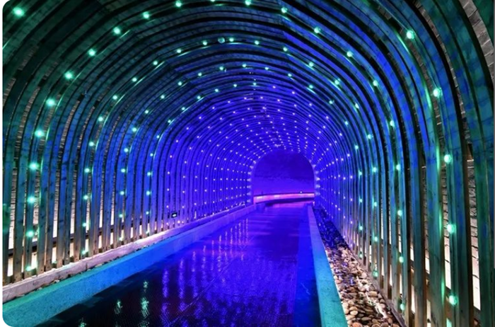 大厅古井泉眼中,无极水泉不断上涌,井边云雾缭绕,代表古井不懈追求、企业蒸蒸日上之意。时光隧道曲水流觞,两侧地下酒泉不断上涌,源源不绝,整个时光通道借鉴了古地下运兵道的建筑理念,并将其整体放大,采用无梁建筑结构,通过时光隧道穿越,我们将古代的运兵藏兵之所转变成为今天窖藏美酒的酒窖。