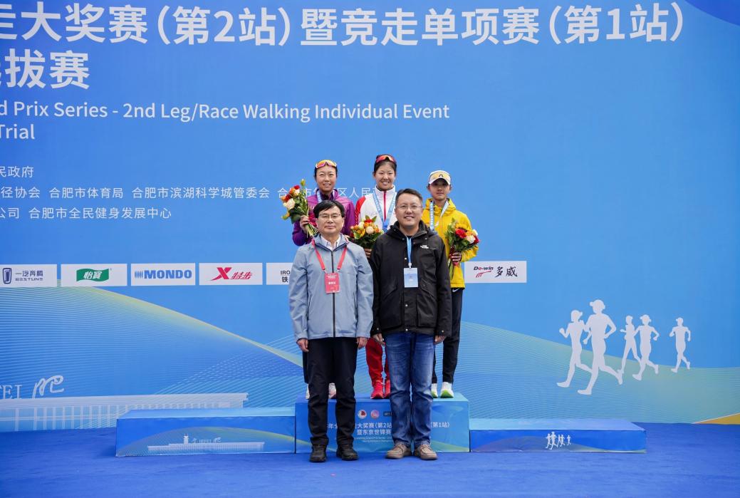 合肥市体育局党组书记李仲生、合肥滨湖科学城城市空间运营管理有限公司总经理沈强为女子大奖赛成年组35公里竞走前三名颁奖